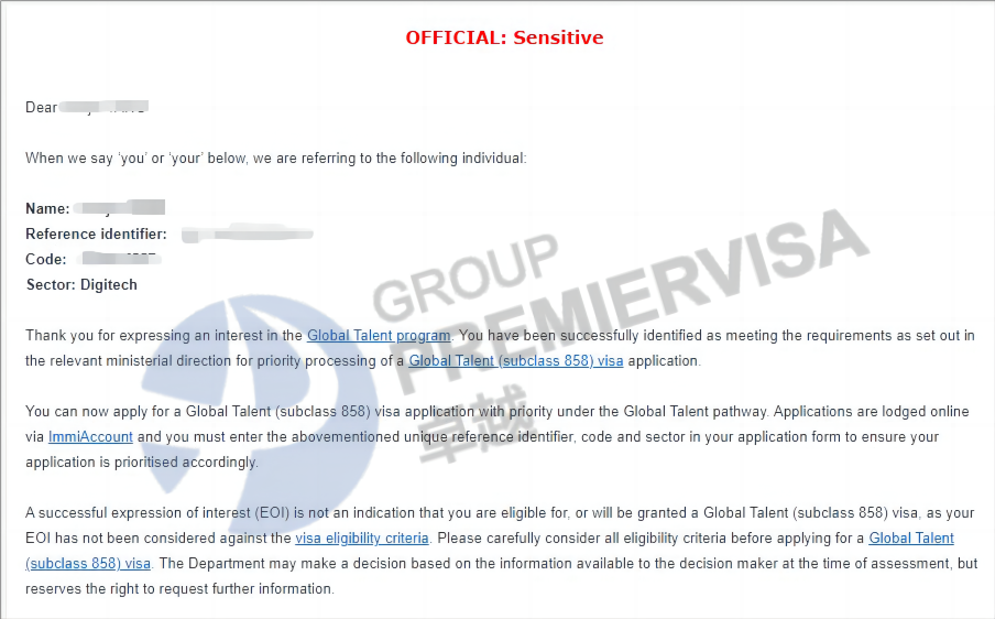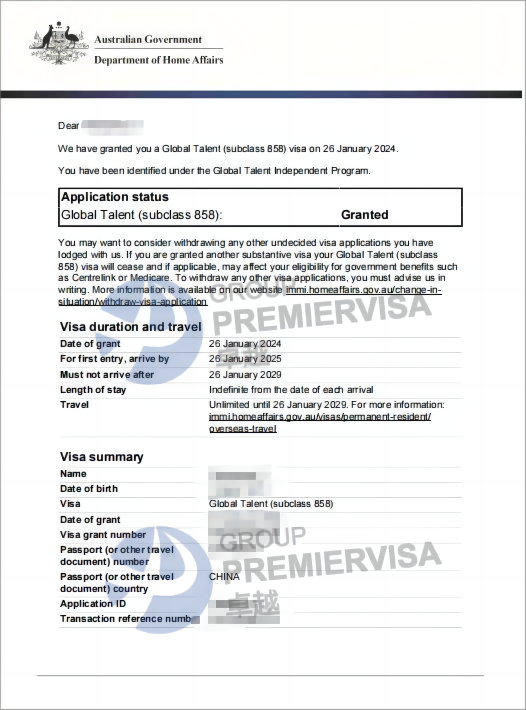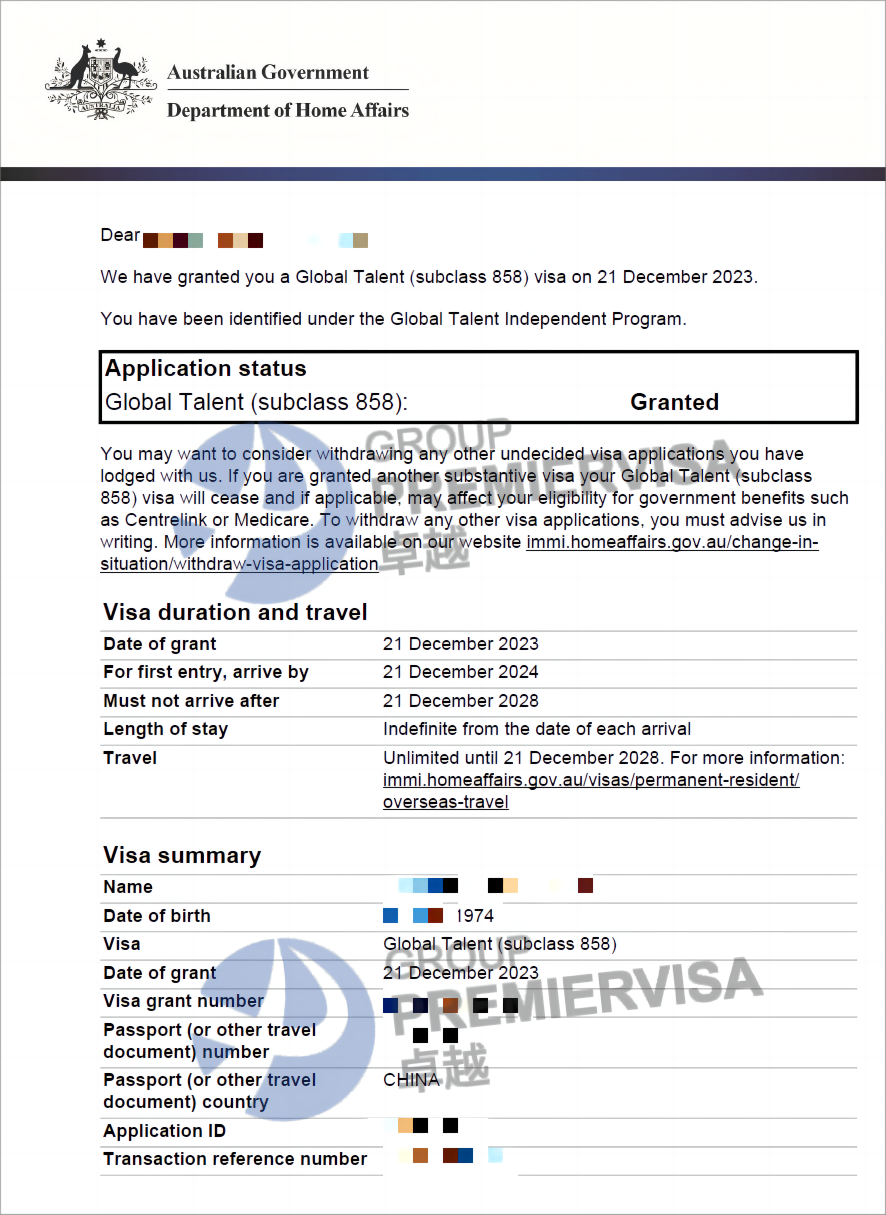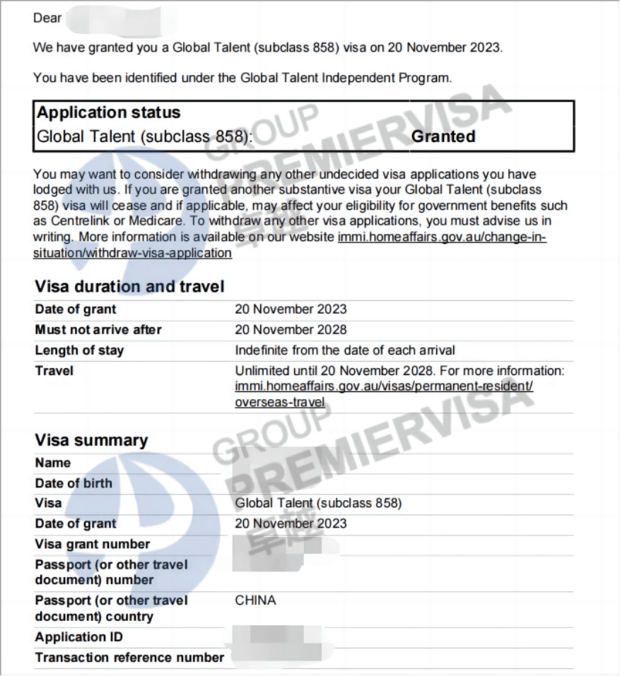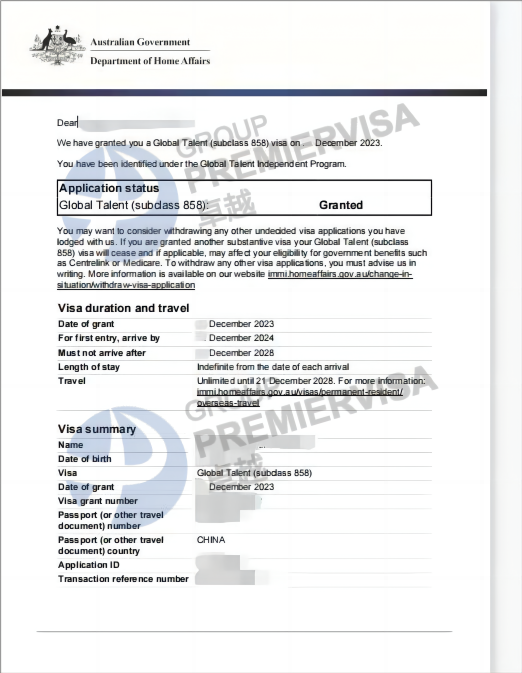 | 案例简介 | 客户2022年11月8日递交GTI-EOI,2023年6月23日GTI-EOI获邀;2023年7月24递交858签证,中途要求尽快做体检以及提名人相关补料,客户很配合,最终2023年11月20日下签! |